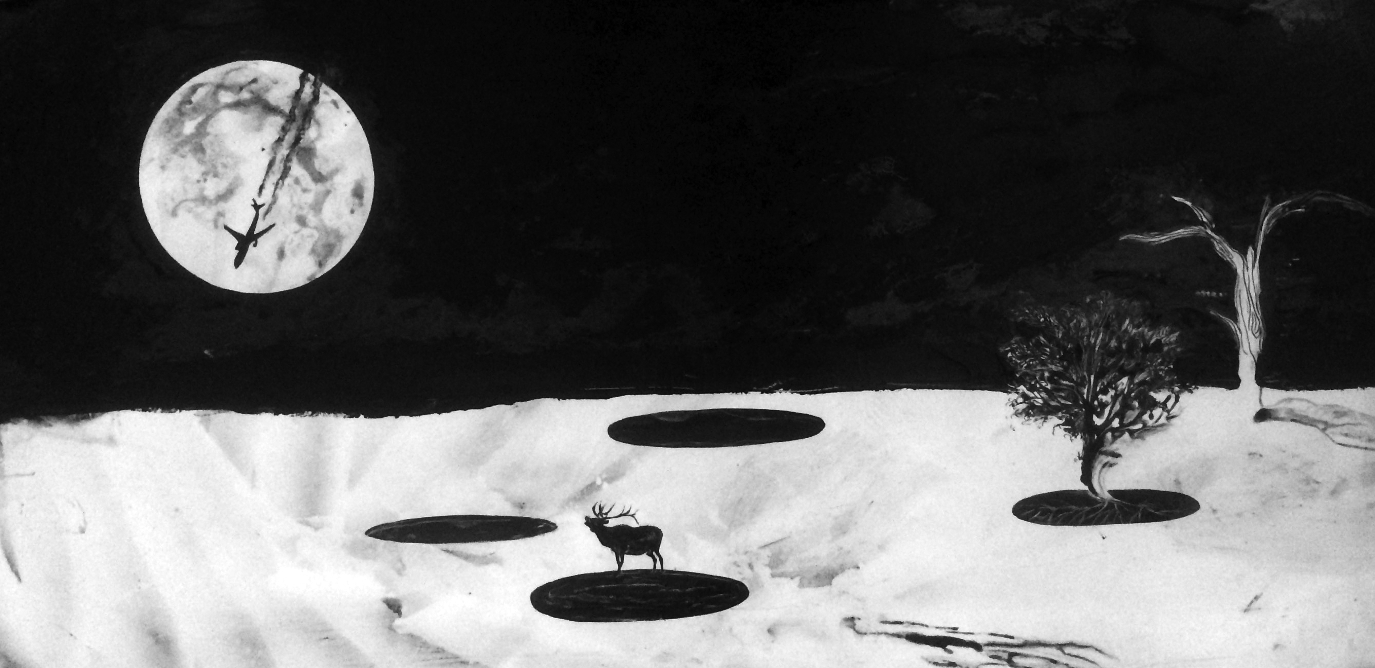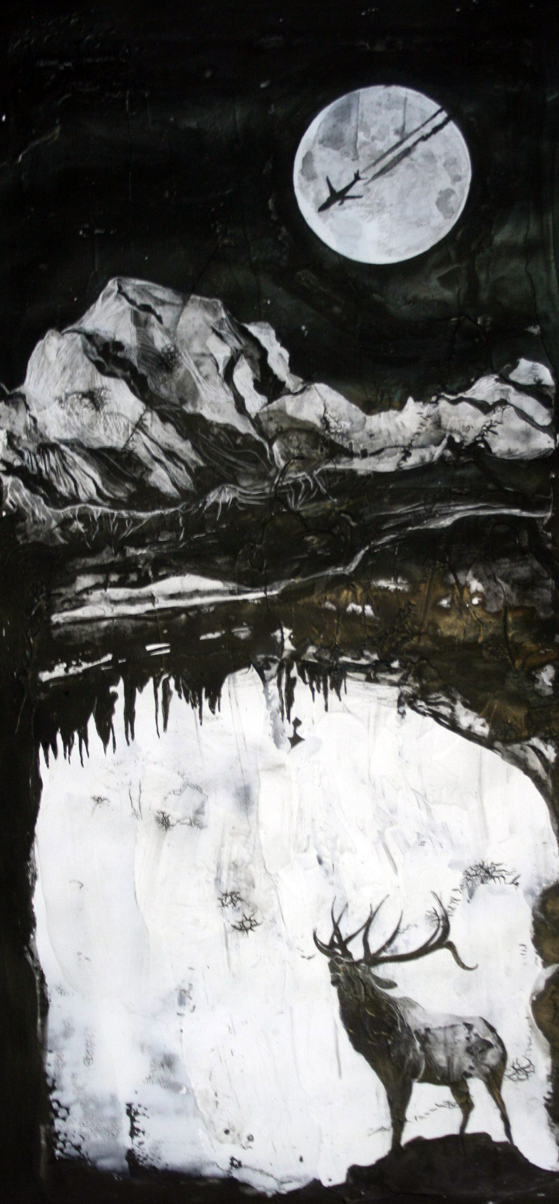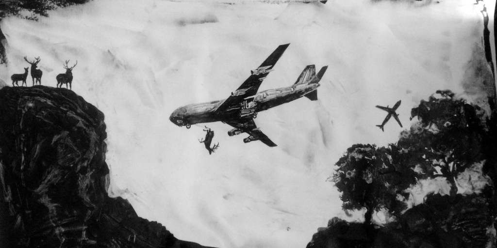 Among the chaos, the presence of deer, symbols of peace, passed by restlessly, their significance both felt and unfelt. The direction of the plane, the transporter of people, remained ambiguous—was it falling or flying, its destination unknown? Nature, frozen in time, held a heavy presence, indifferent to our human concerns. Nature, an ever-forceful presence in my paintings, shows no mercy; it continues its relentless march, unconcerned with our emotions or needs. While we try to achieve a brief respite, nature moves on, very hard and continues all the time without stopping.