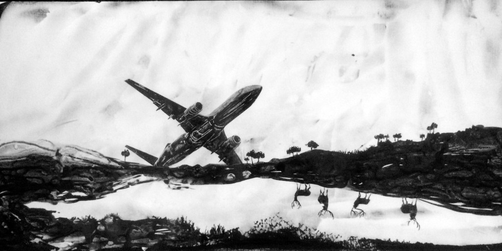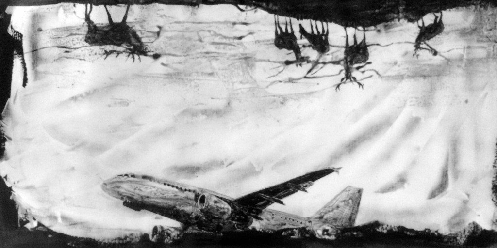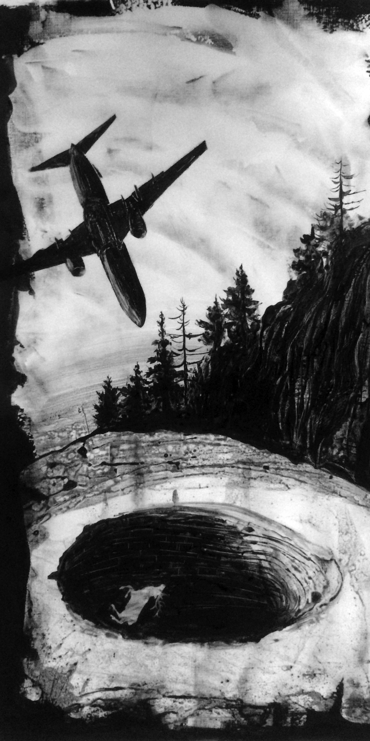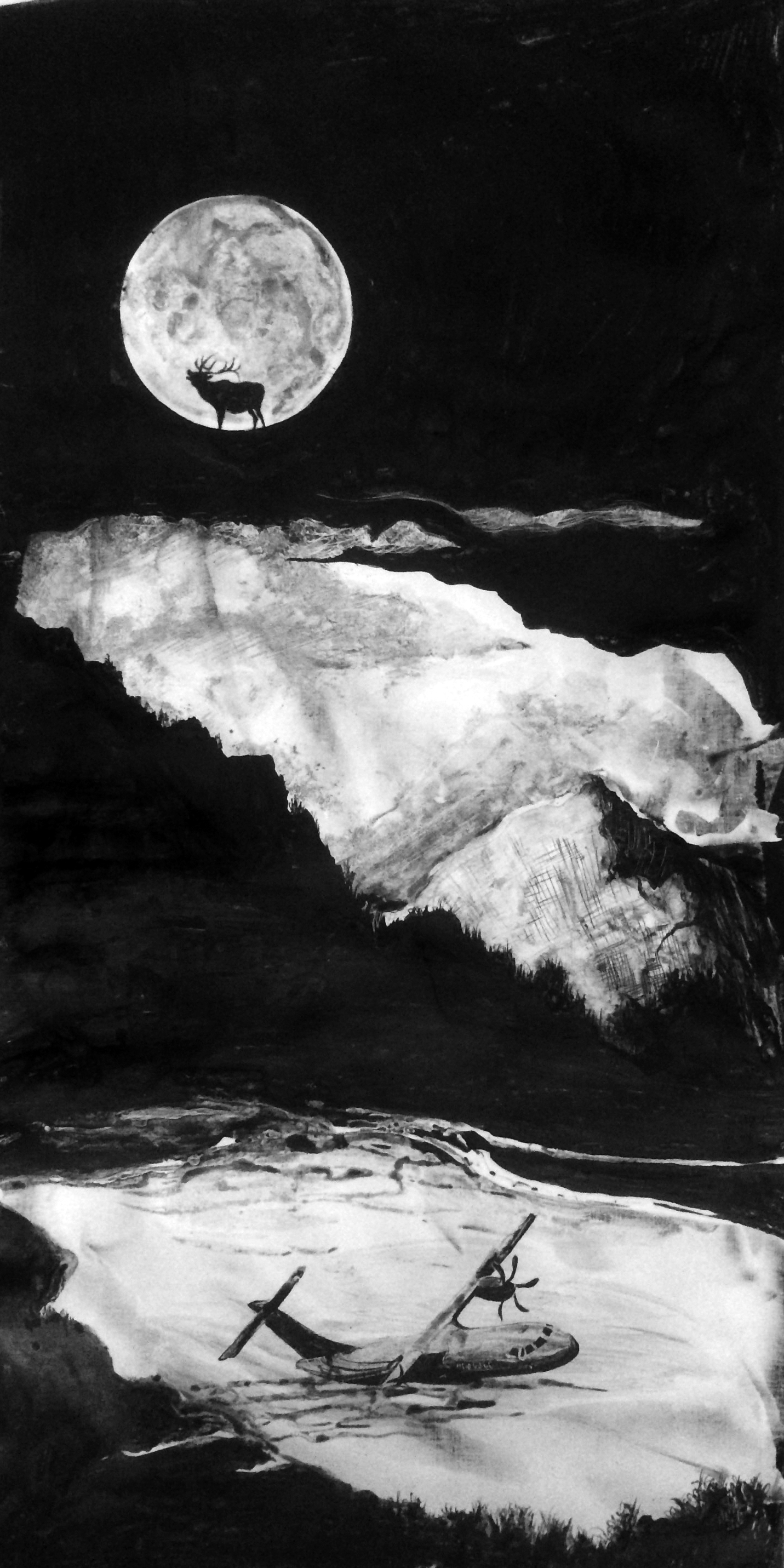 Among the chaos, the presence of deer, symbols of peace, passed by restlessly, their significance both felt and unfelt. The direction of the plane, the transporter of people, remained ambiguous—was it falling or flying, its destination unknown? Nature, frozen in time, held a heavy presence, indifferent to our human concerns. Nature, an ever-forceful presence in my paintings, shows no mercy; it continues its relentless march, unconcerned with our emotions or needs. While we try to achieve a brief respite, nature moves on, very hard and continues all the time without stopping.